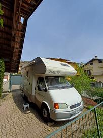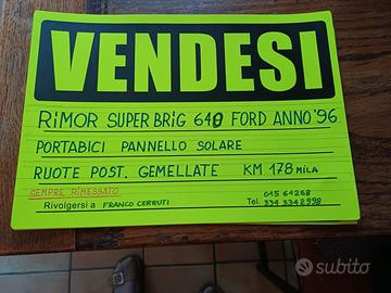 Rimor super brig 640 Ford anno 1996 con portabici, pannello solare, ruote posteriori gemellate, sempre rimediato, motore in buone condizioni. Sei posti letto (due mansarda, letto a castello, tavolo ribaltabile), con cucina e frigo in buone condizioni