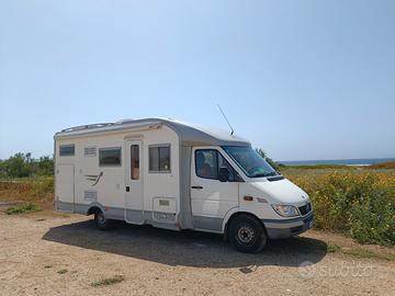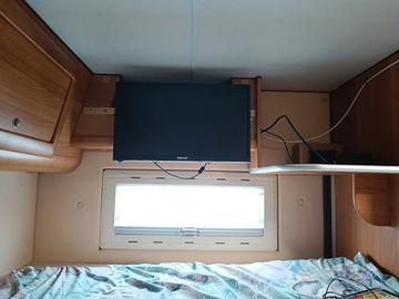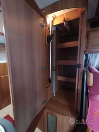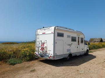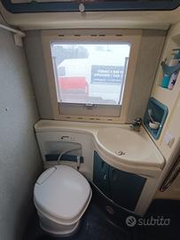 Sono presenti tutti i servizi di base: cucina 3 fuochi e forno a gas, frigo grande trivalente 150 l. con freezer, bagno con doccia separata perfettamente areato con aspiratore-ventilatore elettrico nel box doccia separato e chiuso da ante rigide e due bocchette di riscaldamento, letto in coda sopra il garage (grandissimo) e letto basculante sopra la dinette, due antenne tv e due postazioni tv, due serbatoi di acqua da 100 l. l'uno, sedili di guida girevoli, ampio garage e portabici posteriori, raffrescatore viesa holiday 3, telecamera posteriore e sensori parcheggio posteriori, allarme sia perimetrale sia volumetrico, zanzariere e oscuranti su ogni apertura, luci a led interne, veranda e tavolo con sedie per l'esterno completo di tappeto.