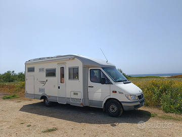 Sono presenti tutti i servizi di base: cucina 3 fuochi e forno, frigo grande trivalente 150 l. con freezer, bagno con doccia separata perfettamente areato con aspiratore-ventilatore elettrico nel box doccia separato e chiuso da ante rigide e due bocchette di riscaldamento, letto in coda sopra il garage (grandissimo) e letto basculante sopra la dinette, due antenne tv e due postazioni tv, due serbatoi da 100 l. l'uno di acque bianche, sedili di guida girevoli, ampio garage e portabici posteriori, raffrescatore viesa holidai 3, telecamera posteriore e sensori parcheggio posteriori, allarme sia perimetrale sia volumetrico, zanzariere e oscuranti su ogni apertura, luci a led interne, veranda e tavolo con sedie per l'esterno completo di tappeto.