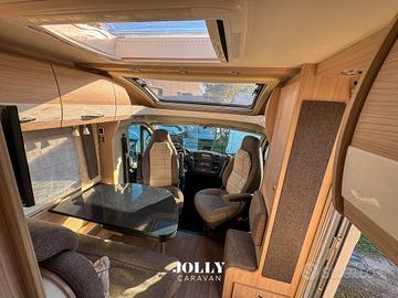 Gli interni Bürstner, curati e luminosi, ospitano un letto trasversale posteriore da 200×140 cm, una dinette trasformabile e una cucina ben organizzata.