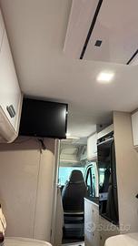 Illuminazione a LED in tutto il camper, comprese luci orientabili, e tavolo allungabile con sedili anteriori girevoli per creare una comoda zona living.