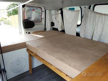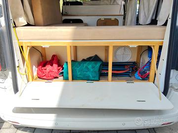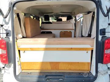 vendo camperizzazione van per modelli passo medio 4,99m di lunghezza totale, 2,30m spazio interno dai sedili anteriori al portellone posteriore. L'allestimento era presente su Citroen Jumpy ma può essere collocato su Toyota Proace, Opel, Peugeot ecc, essendo tutti modelli uguali a livello di spazi. E' composto da 4 moduli: -un pavimento ripiegatile a foglio in due di 1,5cm multistrato con pavimentazione incollata sopra. -un box posteriore con anta calamitata come da foto -un letto a doghe richiudibile a fisarmonica come da foto -un blocco cucina con lavello nautico e rubinetteria nuovissima compresa, tavolino allungabile esternamente al van, e tavolino apribile internamente al van tappezzeria materasso fatta su misura con di 10cm di spessore composta da due blocchi, uno ripiegatile appoggiato sopra la rete con la possibilità di sedersi comodamente appoggiando la schiena e l'altro perpendicolare sul box posteriore. materassi rivestiti di Alcantara facile da aspirare e possibilità di sfoderarli per lavaggio. i materiali si possono visionare e per qualsiasi informazione aggiuntiva sulla costruzione o funzionamento rimango a disposizione. è un allestimento unico con questa configurazione e creato per esigenze specifiche, è stato usato da due persone con altezza max di 1,80m. prezzo trattabile, valuto offerte congrue