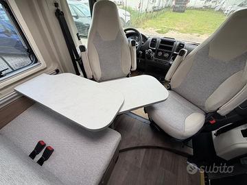 Nonostante le dimensioni contenute, gli spazi interni sono organizzati in modo molto intelligente. La zona living è composta da un divanetto fronte marcia dotato di attacchi ISOFIX, affiancato dalle poltrone cabina girevoli e da un tavolo estensibile, creando un ambiente conviviale e funzionale. Sopra la dinette troviamo un oblò panoramico, che insieme alle finestre dona grande luminosità all'abitacolo.