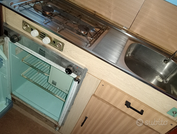 Cucina, frigo trivalente, fornelli e lavandino. Stufa a gas come da foto.