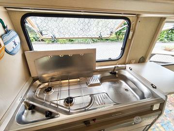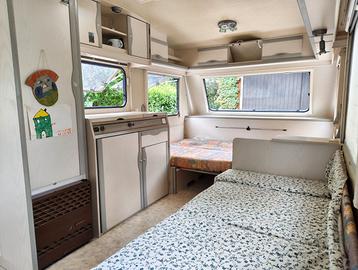 Caravan spazioso ed affidabile, in ottime condizioni, sempre rimessata in garage. Revisionata luglio 2025. Il caravan dispone di letto a castello nella parte posteriore, bagno con lavandino, specchio, doccia e WC Thetford a cassetta estraibile, blocco cucina con 2 fuochi e frigo trivalente da 70 litri e piccolo freezer; riscaldamento trumatic, tavolino singolo trasformabile in un letto aggiuntivo e tavolo grande con giropanca finestrato nella parte anteriore, anche esso trasformabile in un comodissimo letto matrimoniale. E' ricco di diversi armadietti e panche con vani apribili dove stipare all'occorrenza. Possibilità di avere la veranda esterna, completa di stuoie. Comprende ruota di scorta e gancio a sfera con stabilizzatore. Peso a vuoto 915kg Dimensioni esterne 667x 229 x 254 cm Dimensioni interne 500 x 217 x 192 cm Pneumatici 195/70 R14 5 posti letto 8 finestre apribili con zanzariere Trasformatore da 220/12 V Luce veranda esterna Portabombole integrato per 2 bombole da 10 L Serbatoio da 40 L di acqua con pompa elettrica Disponibile per informazioni