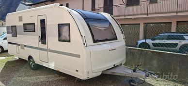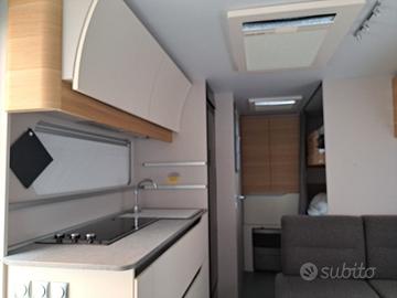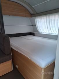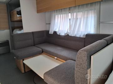 Caravan moderna a 7 posti letto lunga circa 7,8m Camperizzata con Mover e Tendalino elettrico Ampia dinette centrale, 3 letti a castello e matrimoniale in testa, bagno con box doccia separato e ampia cucina.