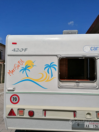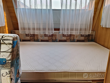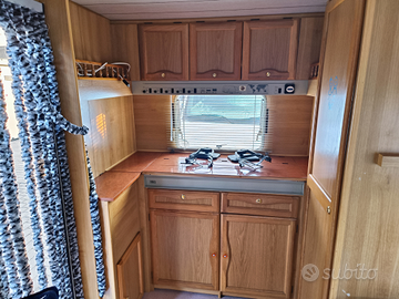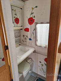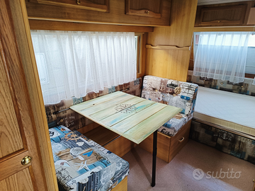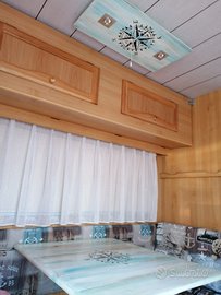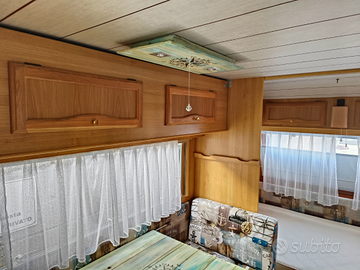 Internamente si presenta nuova con tavolino autocostruito, plafoniera con faretti artigianale, illuminazione dinette a led, i cuscini sono rivestiti con stoffa personalizzata sfoderabile e sotto si trova ancora la sua tappezzeria perfetta.