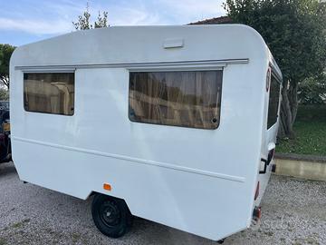 Vendesi rarissima caravan Franza modello Derby 350, un vero gioiello per amatori e professionisti. Grazie alla cellula monoscocca in vetroresina, il mezzo è strutturalmente eterno e totalmente immune da infiltrazioni. Dati Tecnici: • Stato: Ottimo stato, pronta per la strada. • Revisione: In regola, prossima scadenza Gennaio 2028. • Dimensioni: Compatta e maneggevole (Lunghezza 4,46 m | Larghezza 2,08 m). 3/4 posti letto • Peso: Massa complessiva solo 700 kg (trainabile da quasi ogni auto con patente B). • Meccanica: Pneumatici in buono stato. Accessori inclusi: Veranda recente in ottimo stato completa di pareti e telo di copertura invernale su misura. La struttura in vetroresina la rende ideale non solo per il campeggio, ma anche come base perfetta per un progetto di Street Food o Temporary Shop, grazie alla facilità di verniciatura e modifica delle pareti, con il suo stile vintage vi permetterà di partecipare a fiere, eventi, mercatini e sagre ed ampliare la visibilità della vostra attività.