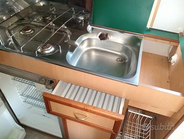 Cucina, Frigo trivalente, 2 fuochi, lavandino e armadietto.