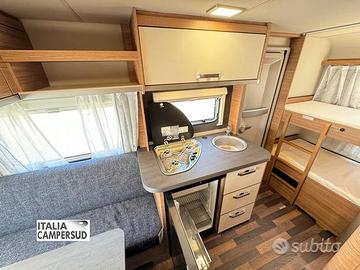 Roulotte 4 Posti Letto Suddivisa Con 2 Letti a Castello Posteriori Una Cucina Attrezzata Ed Un Bagno Con Doccia ed Infine Un Letto Matrimoniale Anteriore Trasformabile In Dinette Grande Con Tavolo Centrale
