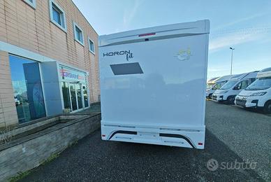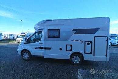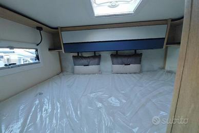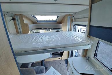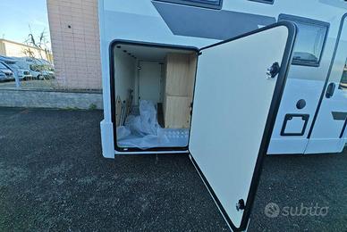 Semintegrale compatto con letto matrimoniale trasversale e sottostante gavone garage, bagno con doccia e cucina con frigo 137 l nella zona centrale, dinette a L con sedili anteriori girevoli e letto basculante singolo.