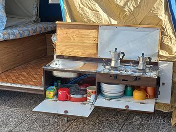 Comprende un frigo, il cucinotto, la veranda (non presente in foto) e tutti gli accessori per il montaggio e per il campeggio.