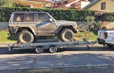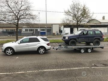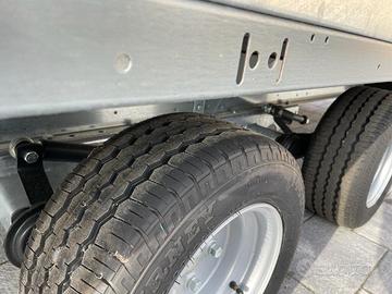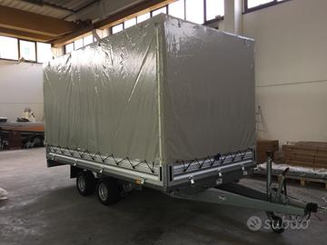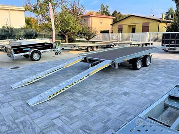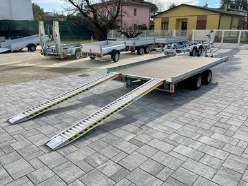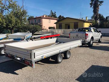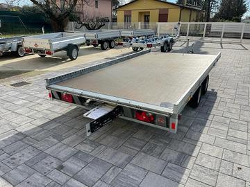 Carrello rimorchio Multi-Funzionale per Auto Cose Miniecavatori Pantografi Ragni ecc. Dimensioni 408x203 cm robusto pianale in plywood antiscivolo dotato di rampe in alluminio salita con ripostiglio sotto il pianale piedini regolabili in altezza posteriori antiribaltamento spondine multipoint con 60 anelli di fissaggio ******* Raffinate Sospensioni indipendenti con ammortizzatore ******** Versione 2700 kg omologabile 2000-2200-2400-2500-2700 kg Versione 3500 kg omologabile 3490 kg o declassamenti s celta 3200-3000-2800 kg ecc. Possibilità kit sponde in alluminio pesante apribili ed amovibili sui 4 lati sede Trailer Point srl o mob