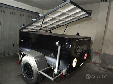 Vendo carrello esemplare unico in Italia, omologato, dotato di n°4 portapacchi della rinho rack, 3 cerci in lega Toyota, gomme Bf goodrich mud 33, stabilizzatori, tendalino laterale Raptor, vasca acqua con motore da 60 litri, cassettiera ARB, batteria 12v, impianto 12v e 220w, carico esterno per acqua, prese esterne per alimentazione 220w, tetto apribile autonomamente, il carrello è interamente in alluminio.