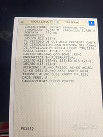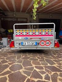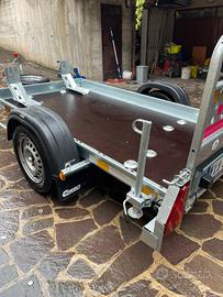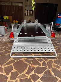 Carrello con impianto frenante Cresci tp6 con rampa di carico piedini di stazionamento pianale in compensato marino senza alcun segno n 2 porta moto ganci a scomparsa sul pianale ruota di scorta con lucchetto catena antifurto da collegare al gancio traino