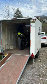 Vendo carrello porta moto/kart, anno 2001, internamente dotato di blocca ruota, ganci per fissaggio e scaffalatura; carrello frenato con timone nuovo; spina corrente e attacco per tubo aria esterno; gommato nuovo.