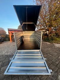 Rimorchio per trasporto cose Lunghezza 2,988 m Larghezza 1,586 m Portata 605 kg Cassone con sponda ribaltabile Ruota di scorta