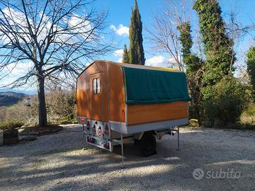vendo fantastico carrello roulotte vintage norvegese anno 1966 marca Wideroe modello Lillebror, in compensato marino e tela cancmvas , completamente ripiegabile e richiudibile in carrello appendice, di soli 220 kg di pezo totale . esemplare unico in Italia (e solo alcupa ) ed in perfette condizioni , ORIGINALISSIMO E FUNZIONALE , da vedere . 2 comodi posti letto con predispisizione per altri 2 posti su cuccette tipi nautico , completo di veranda esterna . contattatemi per ulteriori informazioni e se davvero interessati , regolarmente revisionato , gommato, completo di ruota di scorta ..