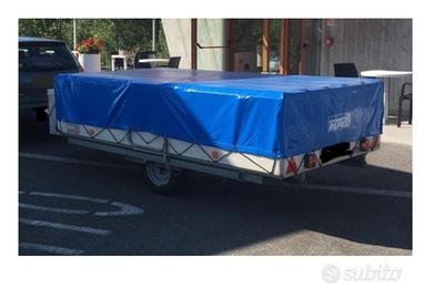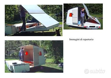 carrello apribile modello rapido confort (il piu' grande della serie rapido) con gancio traino che si trasforma in roulotte. Si apre in 20 minuti completo di tutti gli accessori e mobili , 4 ambienti interni pareti solide interni come nuovi . Aperto offre circa 11 mq interni , dotato di 1 letto ad 1 piazza e mezzo e due lettini unibili chiuso misura 3,90 di lunghezza totale compreso il timone ed 1,60 circa di larghezza .Chiuso con il telo protettivo si conserva egregiamente e lo si puo' parcheggiare in spazi ristretti (risparmio per un rimessaggio annuale) aperto non ha nulla da invidiare ad una roulotte convenzionale , non necessita di assicurazione ha targa ripetitiva , si paga solo 34 euro l' anno per la tenuta del gancio traino ottimo affare molto pratico e maneggevole , si trasporta meglio di una roulotte e fa consumare meno carburante in quanto chiuso non oppone resistenza al vento ed offre una maggiore visibilita' posteriore alla guida , il passsaggio di proprieta' costa sui 140 euro circa