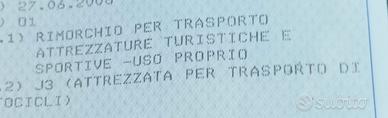 Carrello omologato TATS (trasporto attrezzature turistiche e sportive) attualmente porta moto 3 posti. Tenuto molto bene, sempre al coperto, usato poco. Revisione scaduta.
