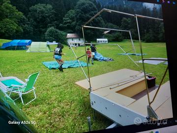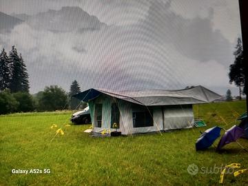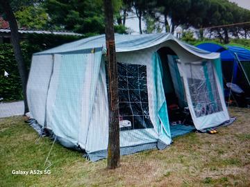 Tenda da 4 posti letto + veranda. Tutto in buone condizioni, perfettamente funzionante, pavimento in legno multistrato sostituito integralmente con un legno di qualità, Gomme in buono stato, cuscinetti ruote sostituiti, freni e impianto elettrico in ordine presente anche ruota di scorta . PREZZO TRATTABILE