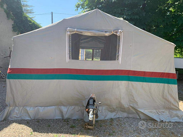 Carrello tenda semiautomatico 6 posti letto, superficie totale 4,5 x 6 mt. Portata a pieno carico 450 kg. Copertura in cotone impermeabilizzato (320 gr/mq). Sospensioni a bracci oscillanti, freno e luci, dotato di ruotino di manovra.