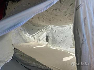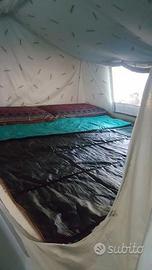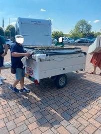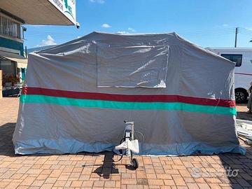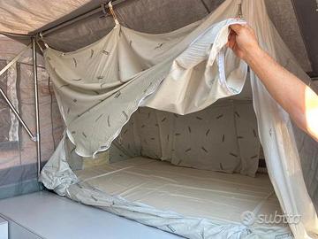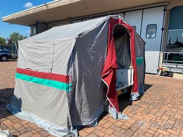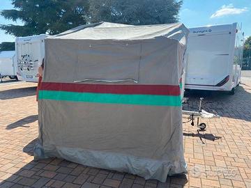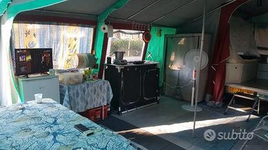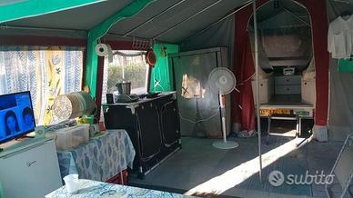 Carrello Tenda CONVER PegasoLa vacanza con famiglia a basso costo!Anno: Maggio 20056 posti letto (3+3)diviso in 2 sezioni:Zona notte: si apre a libro con un letto a sinistra ed uno a destra con doghe in legno, corridoio centrale dove sono presenti 2 cassepanche laterali ed una cassettiera centrale in fondo (dove stivare tutta l'attrezzatura).Zona giorno: (Veranda) si monta come una tenda a casetta ed è molto spaziosa (4.5 m x 4 m) ed è staccabile. Tetto in cotone 100%, impermeabilizzato da 320 gr/mq. Pareti in cotone 100%. La tela è ottima e molto pesante. IL'area sottostante ad una delle camere si può usare come ripostiglio grazie ad una cerniera che crea una piccola porta. Molto comodo e pratico perché se si fa del campeggio stanziale è molto grande (4.5m x 6m), mentre per i weekend è sufficiente la zona notte.Teloncino di copertura in poliestere, cassone in lamiera mm 1,2 zincata e verniciata a polvere. Telaio zincato a caldo, sospensioni a bracci oscillanti e ruotino di manovra. Portata a pieno carico 450kgProduttore ConverModello PEGASOData di immatricolazione 05/2005Lunghezza con timone 294 cmPeso a pieno carico 450 kgPosti letto 6PerfettoRevisionato.PRONTA CONSEGNA