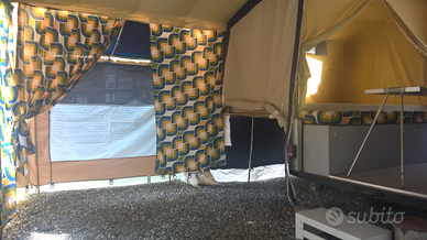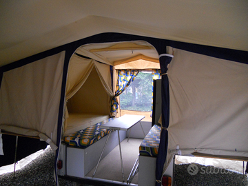Carrello tenda, marca Ferrino, 4 posti letto, veranda, cucinotto, lavello e tavolo. Completo di tende e zanzariere, sia nella zona notte che nella veranda e cucinotto. Telo impermeabile nuovo. Vendo a chi veramente interessato all' utilizzo, il prezzo è naturalmente trattabile.