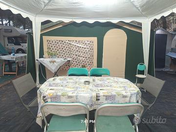 Vendo carrello tenda con 2 letti matrimoniali sollevati da terra 80 cm, con veranda chiusa per un totale aperto di 16 mq il tutto corredato di accessori, cucinino 2mt x 2mt, bagno 2mt x 1,5mt bagno chimico, porta pacchi in acciaio sopra carrello, porta bici, n.2 box auto, porta bici, teli impermeabili n.2 gazebi,armadietti tavolini sedie pieghevoli,luci LED ecc. Ecc.