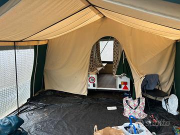 Vendesi come da titolo carrello tenda,sono il secondo proprietario da circa nove anni,tela in buone condizioni con piccole riparazioni effettuate,altre foto disponibili,funzionante,revisionato,gomme nuove,vendita per passaggio a roulotte,il carrello e dotato di tende di intercapedine e tende alle finestre,ha un suo mobiletto cucina e piastra elettrica,altre foto a richiesta
