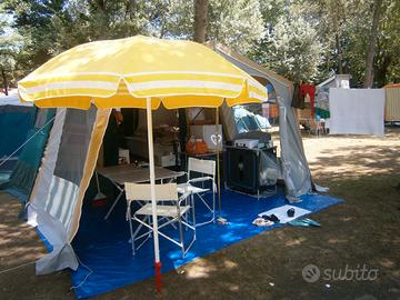 verandina da 2 posti (visibile in foto) con zanzariere e parete anteriore smontabile tramite cerniere. una seconda veranda da 4 persone (mai montata) per aumentare lo spazio. gavone sul timone per tenere eventuale frigo. gomme praticamente nuove. ruota di scorta mai utilizzata.