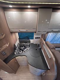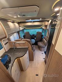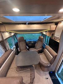 Letto basculante anteriore matrimoniale. Ampia dinette con sedili cabina girevoli, TV LCD 32" a scomparsa.