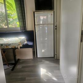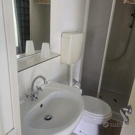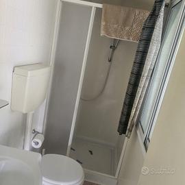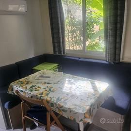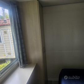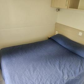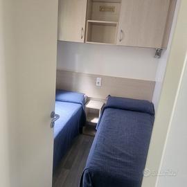 Casa mobile composta da una camera matrimoniale, cameretta ragazzi con due letti singoli, salotto con divano trasformabile in letto matrimoniale, cucina lineare, bagno con box doccia.