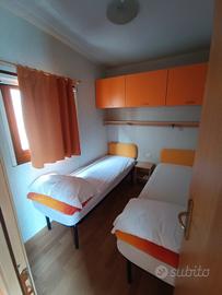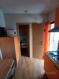 La casa mobile è così composta: all'interno si trova la cucina e un divano ad elle, camera matrimoniale, camerina con 2 lettini e bagno completo di doccia, WC, lavandino e bidet.