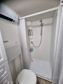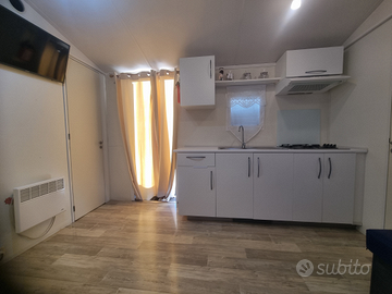 Casa mobile Shelbox composta da una camera matrimoniale,cameretta ragazzi 1 letto singolo,salotto con divano,cucina lineare,bagno con box doccia,grandezza 8metri × 3metri
