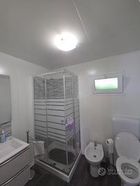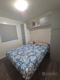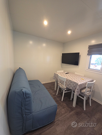 Casa mobile da 35 mq completa di tutti i servizi: Bagno con doccia, 2 camere da letto, soggiorno, cucina completa, riscaldamento a pompa di calore, aria condizionata e spazio esterno riparato da veranda.