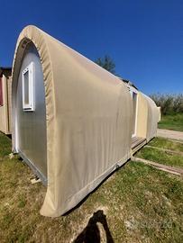 Due camere da letto, (senza bagno, si può installare facilmente), cucina con frigo e ripiani, verandina, impianto elettrico, casetta su carrello con ruote, la struttura è rigida e robusta con tetto in legno ricoperto da telo impermeabile che la fa sembrare tenda. Vendo 5.500 escluso di trasporto ( generalmente vendute a 6000 iva esclusa).