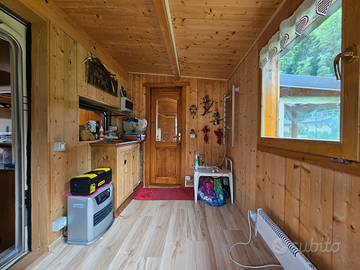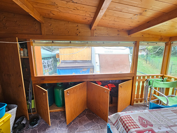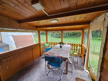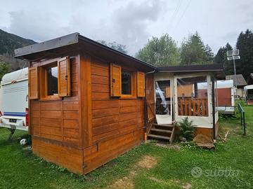 Vendo casetta di legno di 7 mq coibentata con stufa e doppi vetri, divano letto, esternamente portico di 12 mq in legno, mobiletti, tavolo allungabile e tende in pvc.