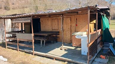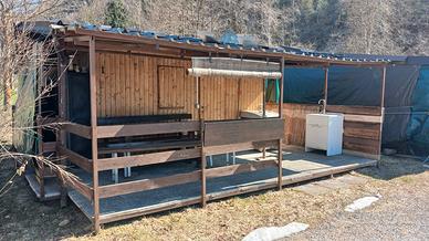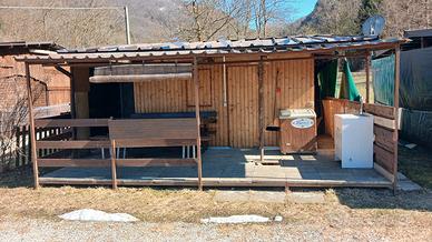 Vendesi casetta in legno da unire a roulotte con terrazzino esterno Grande circa 10 metri quadri, compresa di cucinino e tavolo con seduta trasformabile in letto matrimoniale La roulotte è possibile acquistarla a parte ed è composta da ripostiglio, un letto matrimoniale ed uno da una piazza e mezza Ideale per campeggi, sia al mare che in montagna, nelle vacanze Da smontare e ritirare personalmente sul posto dal campeggio di Roaschia (CN) Per maggiori informazioni su prezzo e condizioni, contattare Corrado al 3287508211
