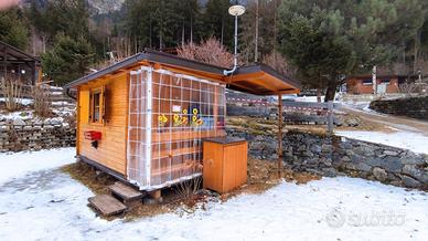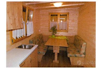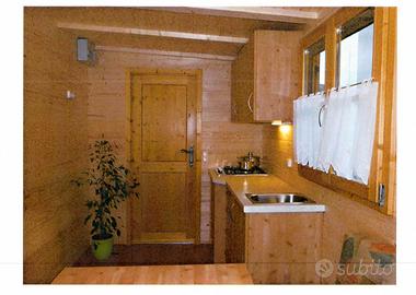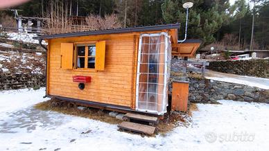 Casetta preingresso accessoriata di tutto quello che serve per essere utilizzata in estate ed in inverno. Attualmente si trova in campeggio "Cima Piazzi" a Cepina, a 5 km da Bormio. La casetta è stata prodotta in Alto Adige, in Abete Nordico massiccio con spessore di ben 5 cm. - coibentata pavimento e tetto - Impianto elettrico completo a norma interno alle pareti, quadro centrale e antenne - angolo cottura completo di piano 4 fuochi gas, frigorifero elettrico 60 lt., lavandino completo di carico e scarico acqua + bidone carellato esterno, mobili cucina e pensili - stufa x riscaldamento a gas Bartolini - dinette con tavolo e due panche contenitrici sempre in legno massello che diventa letto matrimoniale - due finestre con aperture normali e vasistas, complete di oscuri, con doppi vetri, zanzariere, tendine - mobile esterno porta bombole. Tetto casetta e copertura roulotte sono coibentati, in lamiera grecata e legno massello.