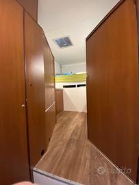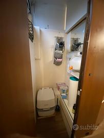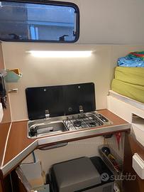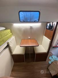 Provvista di letto matrimoniale, cucina due fuochi con lavello, tavolino e sedute, due armadi, due vani porta oggetti sotto ai sedili ed uno sotto il letto, bagno con wc e lavandino (no doccia)