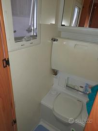 Vano toilette con wc Thetford a cassetta estraibile dall'esterno, parete attrezzata a piano doccia, frigorifero Elettrolux 60litri.