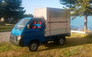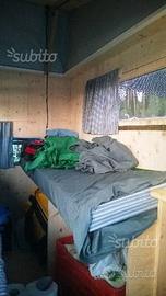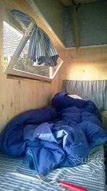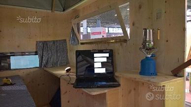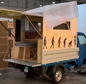 Vendo soltanto la CELLULA ABITATIVA da montare su Piaggio QUARGO (adattabile probabilmente anche al PORTER o altri mezzi simili in base alla dimensione del cassone) realizzata con pannelli in legno a 3-strati verniciati per esterno, dotata di tetto a soffietto con tessuto impermeabile e protezione con lamiera forata in alluminio, oblò sui 4 lati (2 laterali apribili) e visibilità posteriore garantita in cabina di guida, apertura posteriore con portellone dotato di serratura e ganci per veranda, due materassi (grande + piccolo), sul fondo botola apribile per accedere al vano motore.