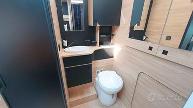 La cucina, moderna e funzionale, è dotata di due fuochi a gas, un lavandino e un frigorifero trivalente da 145 litri, ideale per conservare le provviste durante i soggiorni più lunghi. Nella parte posteriore si trova il bagno, ampio e ben organizzato, con una comoda doccia separata e un armadio spazioso, perfetto per riporre tutto ciò che serve.