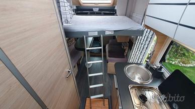La cucina è dotata di un frigorifero trivalente da 134 litri, mentre il bagno ha una pratica doccia separata. Inoltre, il camper dispone di un comodo armadio posteriore per ottimizzare lo spazio di stivaggio.