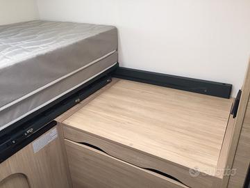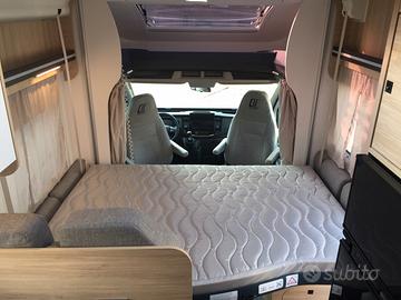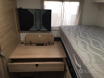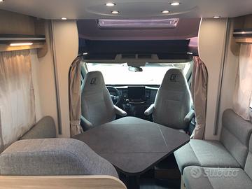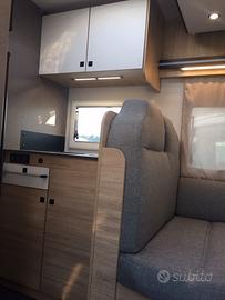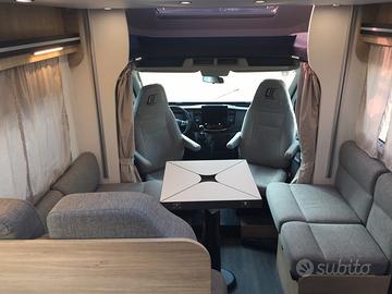 Semi integrale dalla vivibilità eccezionale, la grande dinette accoglie comodamente quattro persone. Centralmente la cucina, dotata di numerosi vani, pensili e frigorifero con cella freezer separata. Zona toilette con doccia contrapposta. La parte posteriore si caratterizza per la presenza di un vero e proprio locale studio-lavoro completamente attrezzato di scrivania, sedile estraibile, supporto per monitor di grande dimensione, prese USB, 12 e 220 volt, piano di appoggio, letto singolo che in un batter d'occhio diventa matrimoniale. In ultimo il gavone capace di contenere tutto il necessario per la vacanza.
