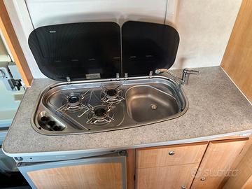 La cucina è completamenteattrezzata, con piano cottura a tre fuochi, lavabo e frigorifero trivalente da110 litri. Il bagno, dotato di doccia separata, garantisce il giusto comfortanche in viaggio.