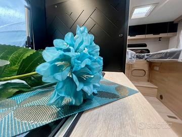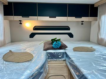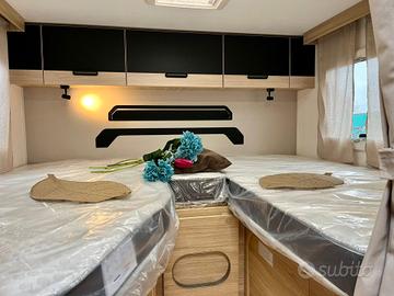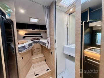 Dotazioni: paraurti verniciati, tecnibox, presa gas esterna, Ford pass, fari e tergicristalli con accensione automatica, fendinebbia, chiusura centralizzata, pre-equipaggiamento tv, riscaldamento diesel, illuminazione esterno, predisposizione pannello solare, pre-cablaggio della telecamera di retromarcia, isolamento gradino ingresso, climatizzatore automatico cabina, airbag conducente + passeggero, freno a mano elettrico, fix and go, sedili cabina girevoli regolabili in altezza con doppio braccio, retrovisori elettrici con sbrinatore, regolatore e limitatore di velocità, ESP, START&STOP, oblo panoramico apribile, tende di separazione cellula/cabina, presa USB/USB-C, presa acqua esterna, struttura IRP tetto pavimento pareti poliestere.