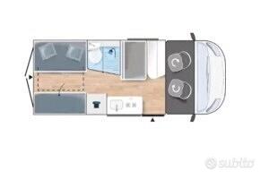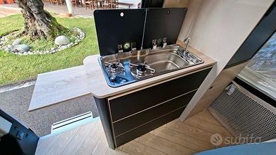 La zona giorno è progettata per accogliere comodamente 4 persone, grazie al tavolo allungabile e ai sedili girevoli. La cucina, ben attrezzata, è dotata di due fuochi a gas, un frigorifero trivalente da 80 litri e vari scomparti di stivaggio, ideali per conservare gli alimenti durante il viaggio.