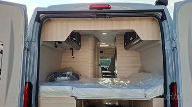 Questo van monta un motore Fiat Ducato Euro 6 da 140 cavalli, con trazione anteriore, cambio automatico a 8 marce e cerchi in lega da 16 pollici neri, che conferiscono al veicolo un aspetto sportivo e accattivante. La cabina è dotata di un autoradio 2Din con porta USB e schermo tattile, comandi al volante, telecamera di retromarcia, aria condizionata, per una guida sempre comoda e sicura. Inoltre, il volante in pelle e le bocchette dell'aria cromate aggiungono un tocco di eleganza e stile.